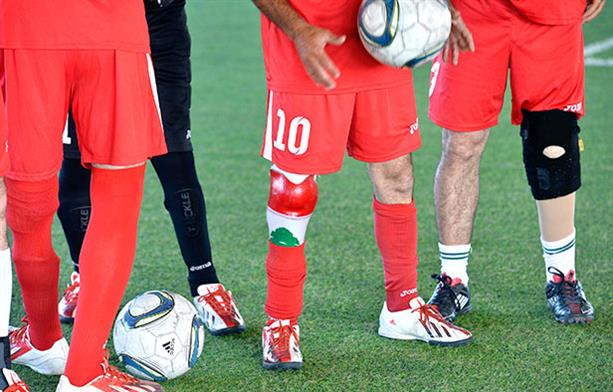 El-Haj, 50, has played for the Lebanese Landmine Survivors’ Football Team since its inception in 2001. He is a slightly tubby goal-hanging striker in the mode of Christian Vieri or the Brazilian forward Ronaldo in late-career. His only difficulties in playing football are that “sometimes I lose my leg when I’m playing and sometimes I don’t score enough goals,” he laughs. El-Haj can be seen regularly haranguing his team-mates for failing to pass to him in goal-scoring opportunities.